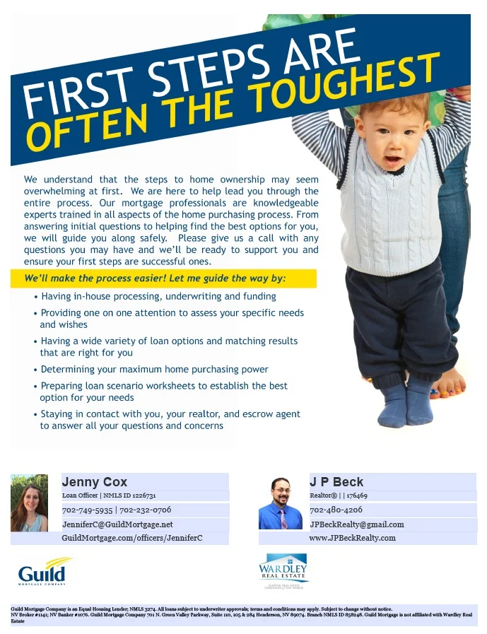 The first step you should take in the homebuying process is to get yourself pre-approved. A good lender can make your entire process smooth as opposed to a bad lender that can kill a deal. This is why I trust Jennifer Cox with Guild Mortgage. She is not only reliable, she also cares about you getting into your home without breaking the bank.